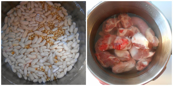 Al día siguiente quitaremos el agua de remojo y pondremos en una olla las alubias y el maíz, cubriremos con 1 litro de agua fría y dejaremos hervir durante 90 minutos a fuego suave, cuidando que no se seque el líquido y sin ponerle sal. Trocearemos las costillas de cerdo y la panceta y colocaremos en otra cacerola junto con los chorizos enteros, cubrimos con agua, agregamos sal y dejamos que hierva durante 90 minutos.