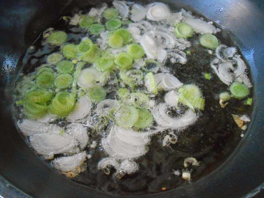 Mientras preparamos la salsa que acompaña al locro, que está hecha con aceite o grasa (manteca) de ternera, cebolla de verdeo (cebolla nueva), pimentón dulce o picante y un poco de ají molido que es como la guindilla.