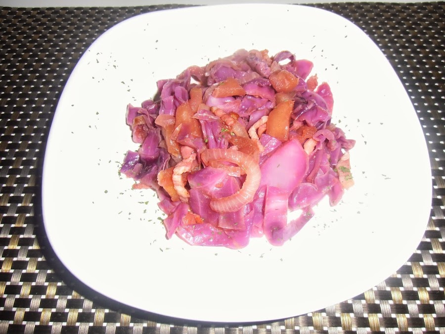 "Haced cocer una lombarda de tamaño medio en cuatro pintas de caldo con dos mitades de manzana reineta, una cebolla picada con un clavo de olor y dos buenos vasos de vino tinto. Espolvorear ligeramente con especias y dejar estofar. Firmado: Carlota de Baviera".