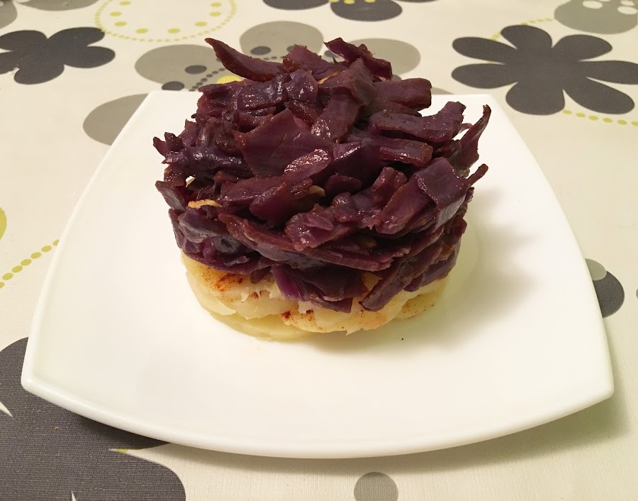 - Con ayuda de un aro de emplatar, coloca una base con las patatas y encima la lombarda al ajillo.
