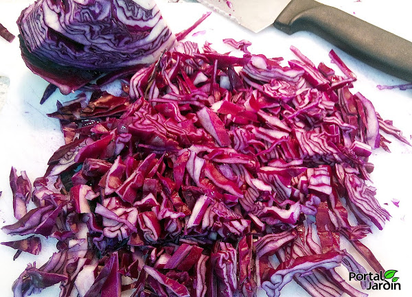 4- Cortamos la col en tiras muy finas y la añadimos.