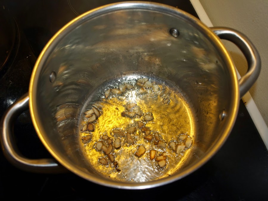 - En una cacerola o sartén grande ponemos a calentar un poco de aceite. Cuando esté listo añadimos un par de dientes de ajo picados y los doramos.
