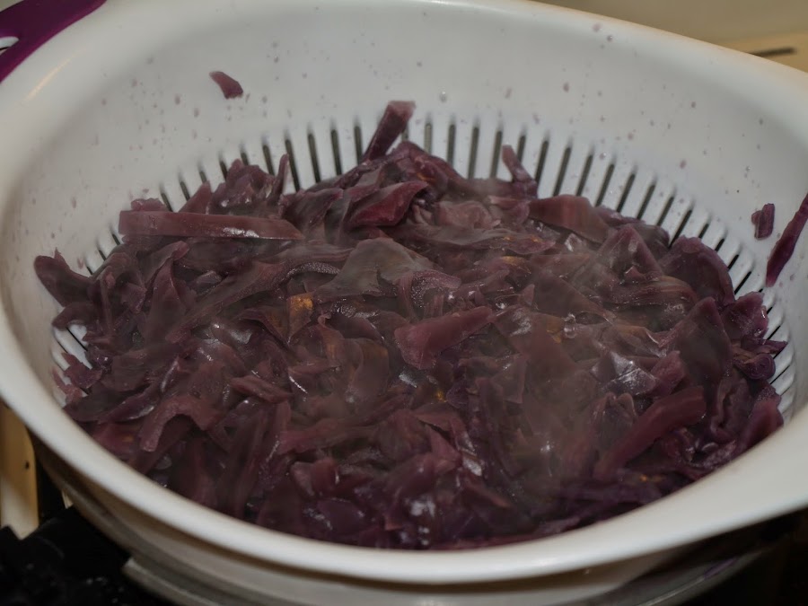 - Cortamos la lombarda en tiras y la lavamos un poco.
