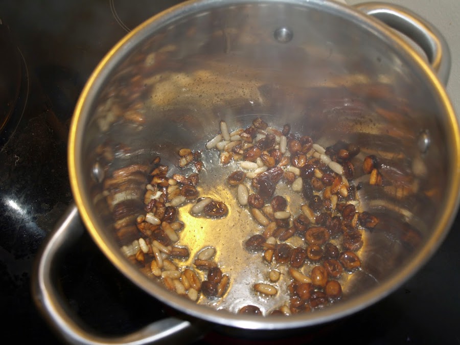 - A continuación echamos las pasas y los piñones (cantidades al gusto) y los doramos también. Cuidado con las pasas sobre todo, que se queman fácilmente. Removed continuamente.
