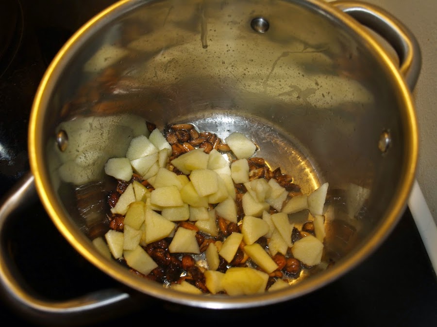 - En cuanto cojan color añadimos la manzana cortada en cubitos y rehogamos lo justo para que también coja algo de color. Sin pasarnos de tiempo para que no se nos deshaga.