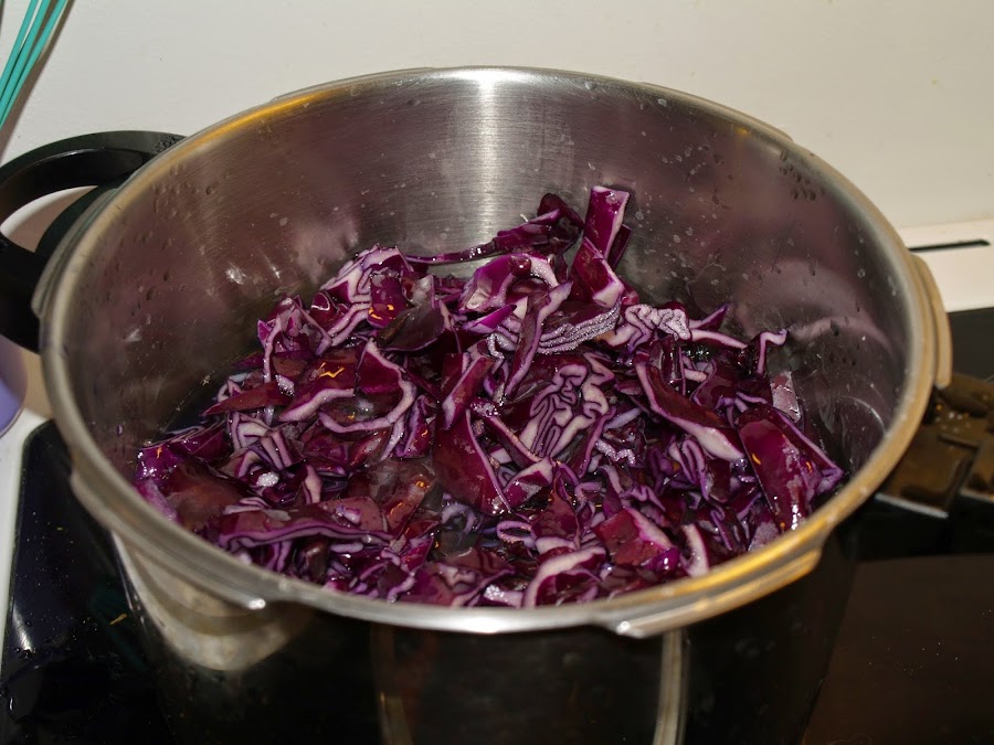 - Ponemos a calentar agua con un poco de sal en una olla y cuando rompa a hervir echamos la lombarda y cocemos. En la olla rápida en tan solo 6- 7 minutos está lista. En la tradicional, el doble de tiempo.
