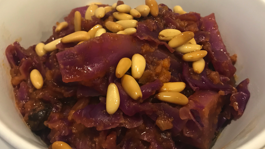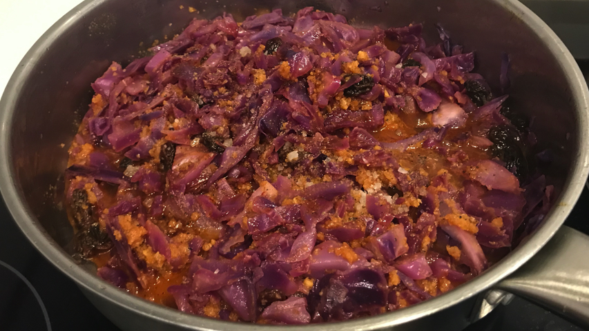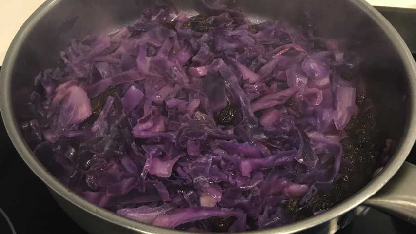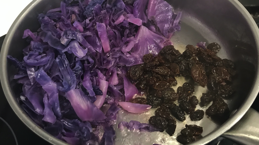 Haz sitio en la cazuela de lombarda e incorpora las pasas escurridas del brandy. Las pasas se pincharán un poco al saltearlas. Mezcla lombarda y pasas.