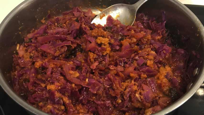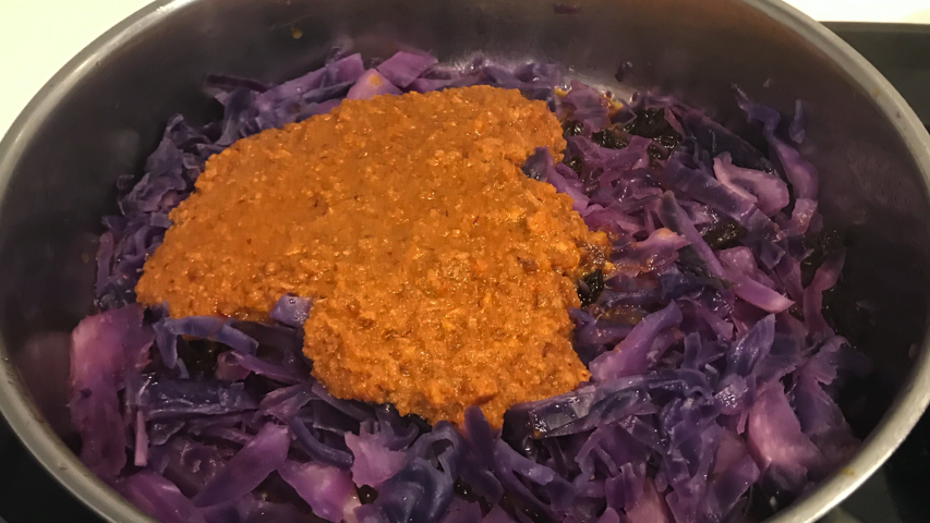 Vierte el contenido del mortero sobre la lombarda. Mezcla. Tapa y deja cocer todo junto 5 minutos a fuego lento.