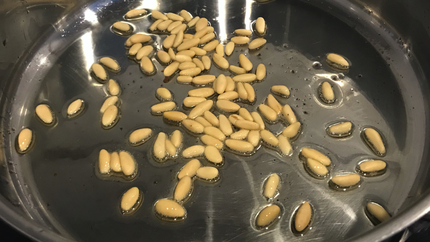 En la misma cazuela dora los piñones sin parar de moverlos (se queman rápido) y en cuanto estén dorados sácalos y resérvalos.