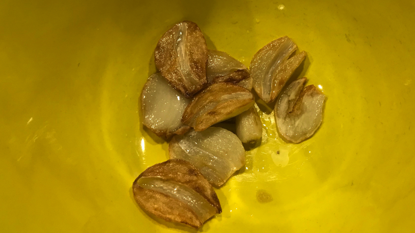 Pela los ajos, córtalos por la mitad y retírales el germen.