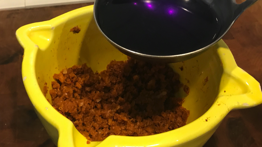 Pon el el mortero al brandy sobrante, líquido de cocción de la lombarda y vinagre (a tu gusto). Mezcla.