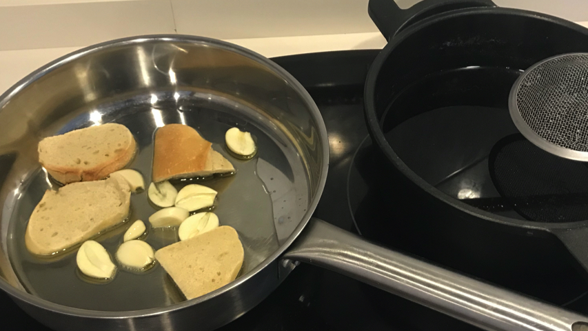 En una cazuela o sartén a fuego medio-alto (7/10) pon un poco de aceite de oliva y sofríe los ajos y unas rebanadas de pan. Cuando tengan un bonito color dorado saca ajos y pan a un mortero.