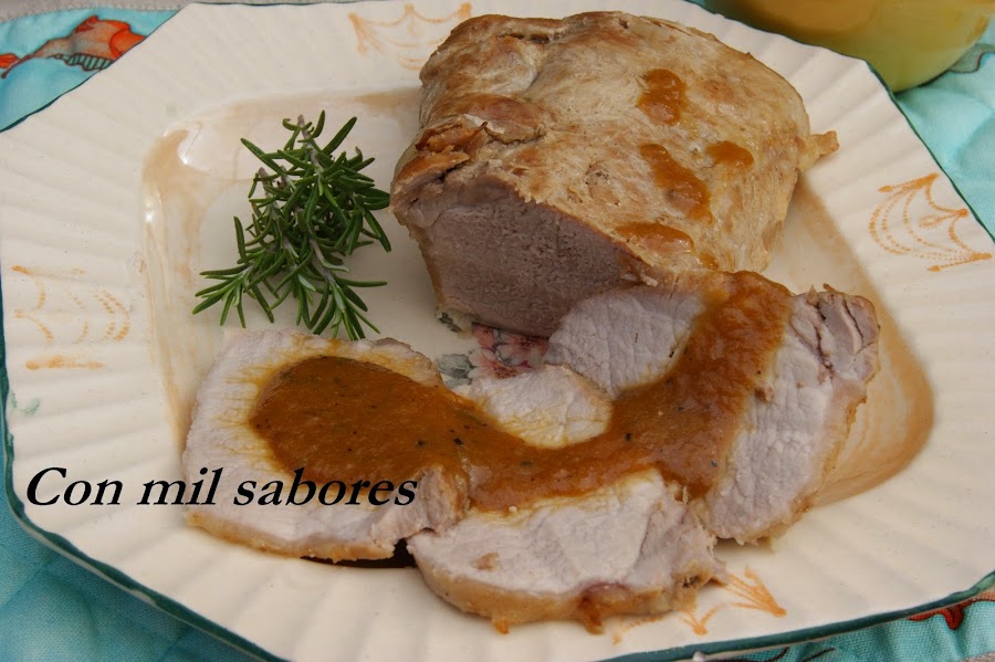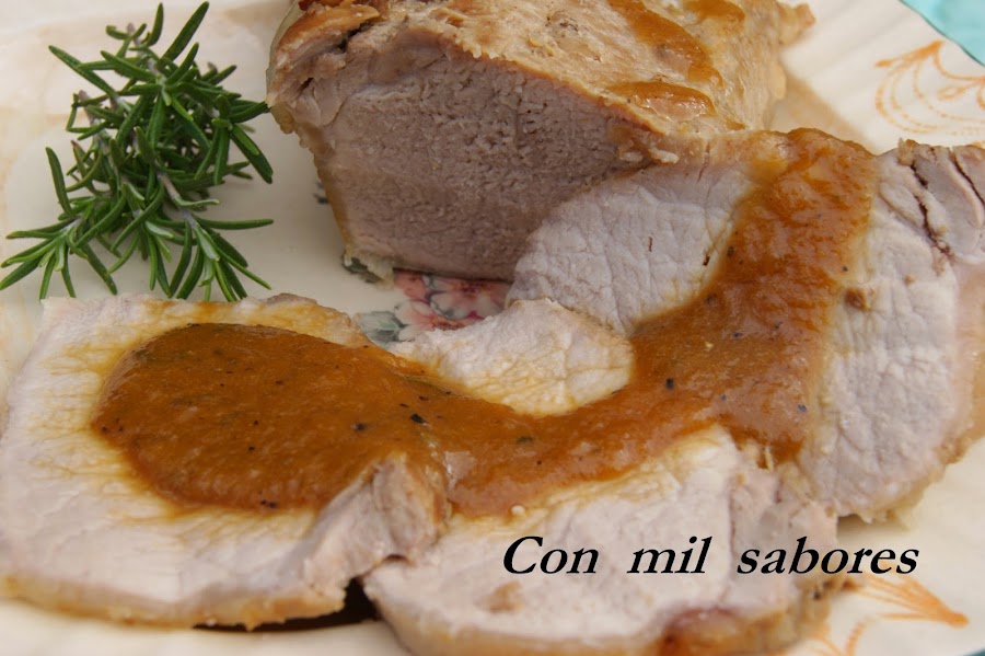 Cuando esté cocido prepararemos la salsa, para ello haremos un caramelo con la cucharada de azúcar y unas gotas de agua.Cuando esté hecho añadir la miel , la pimienta en grano, el romero, las cebollas del asado y todo el jugo del asado del horno. Dejar cocer un ratito todo junto con un poquitín de agua, sacar las ramas de tomillo y triturar la salsa. Servir sobre la carne cortada en rodajas.