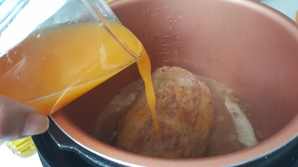 6. - Añadimos el zumo de naranja, medio vaso de agua, tapamos y dejamos pitar 30 minutos, o en olla normal 60 minutos.