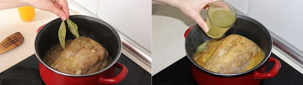 Añadimos las dos hojas de laurel y el caldo de carne. Lo tapamos y dejamos que cueza durante 20 minutos, le damos la vuelta al lomo y si es necesario añadimos mas caldo o agua, y lo dejamos cocer hasta que la carne esté tierna...
