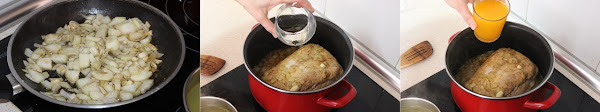 En el mismo aceite ponemos los ajos y la cebolla picada, la dejamos dorar. La añadimos a la cazuela donde tenemos el lomo junto con el vaso de vino blanco. Dejamos hervir unos minutos para que se evapore el alcohol y añadimos el zumo de naranja.