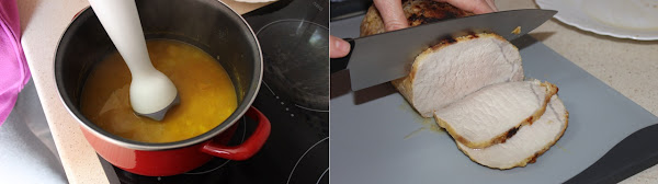 Sacamos el lomo, y trituramos la salsa. La ponemos al fuego y dejamos que reduzca un poquito, si nos gusta mas espesa le añadimos una cucharadita de harina de maíz diluida en una poquita agua.