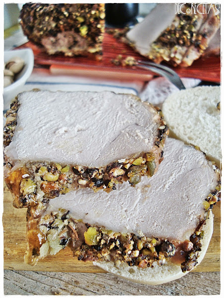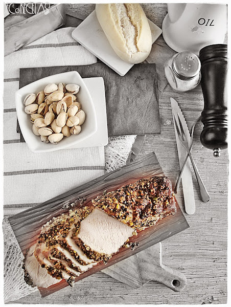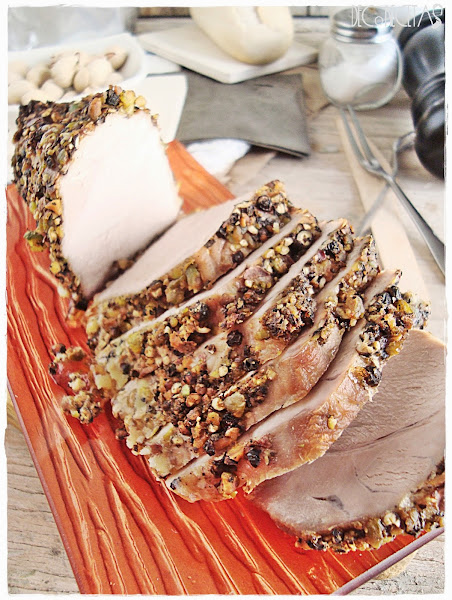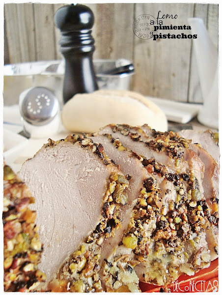 Por otra parte, impregnamos la pieza de lomo con mantequilla a temperatura ambiente por toda la pieza. Acto seguido, rebozamos con la mezcla de pimienta y pistacho abundantemente. En mi caso con ayuda de las manos fui apretando ligeramente para que quedara.