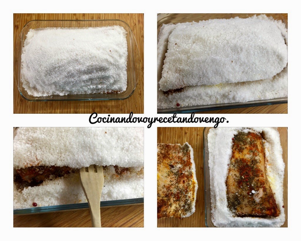 En un recipiente apto para horno y en el que nos quepa el lomo. Colocamos una base de la sal (menos de la mitad del envase, ya que para la parte superior necesitamos más sal que para la base)
