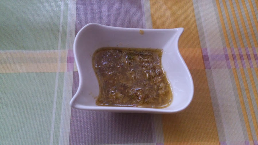 En un mortero hacemos un "majao" con los ajos y las hierbas y le añadimos un poco de aceite, vamos machacando los ajos y vamos añadiendo un poco mas de aceite hasta que tengamos como una salsa (ver foto)