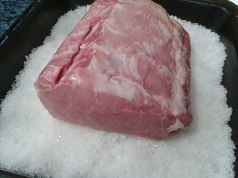 Sobre el lomo ponemos otra capa de sal. La mojamos con las manos y la compactamos alrededor del lomo. No debe quedar a la vista ninguna parte de la carne y la sal debe estar bien prieta.