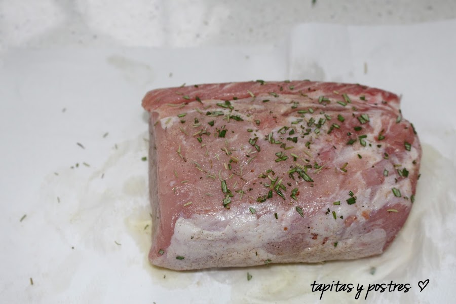 Pincelamos la cinta de lomo por todos lados con aceite de oliva y le espolvoreamos un poquito de pimienta y romero. Yo le he puesto romero fresco de una macetita que tengo, pero podeís usar hierbas secas, las que os guste más (tomillo, orégano, albahaca...)
