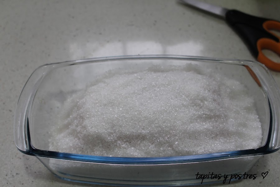En un recipiente apto para el microondas ( en mi caso una fuente de cristal), ponemos una cama gruesa de sal para hornear ,la venden en los supermercados, es especial para estas recetas, aunque creo que la sal gorda común también os serviría.