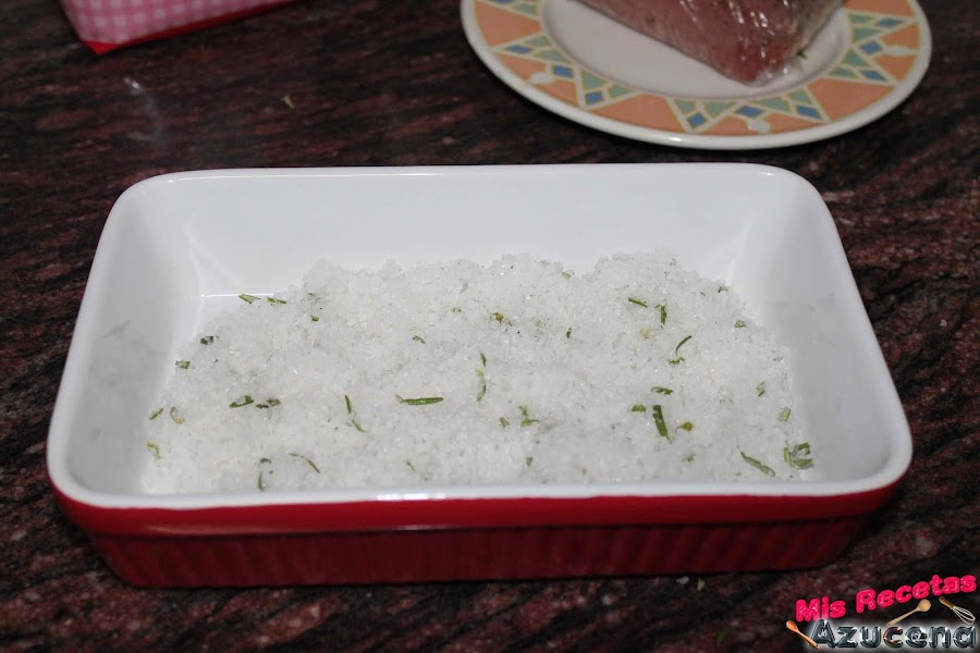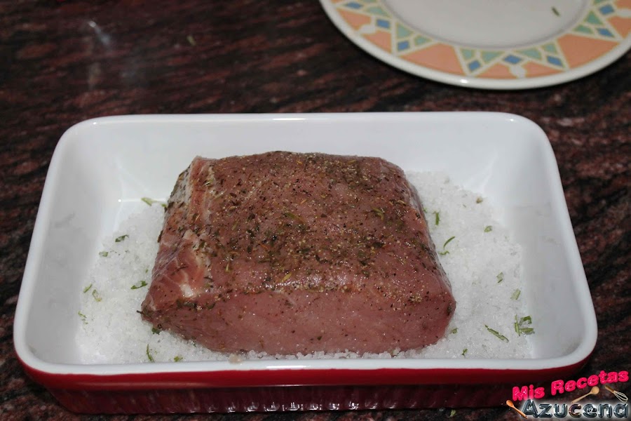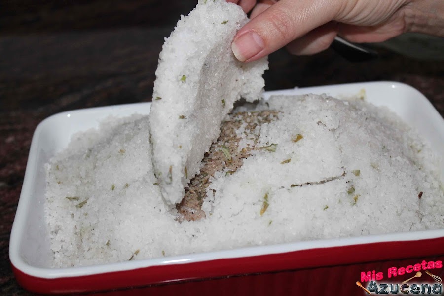 Cogemos la fuente y le pondremos una cama de sal, sacamos la carne de la nevera, le quitamos el plástico film y la ponemos en el centro de la bandeja, cubriremos con sal, la capa que le pongamos de sal para cubrir tendrá que tener un dedo de grosor, tenemos que tener cuidado de que no se quede nada de carne al descubierto, presionamos un poco la sal para darle forma, una vez esté bien cubierta la metemos en el horno y lo dejaremos 35 minutos.