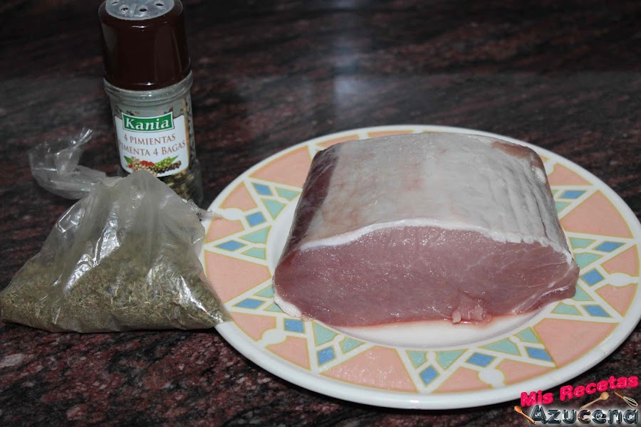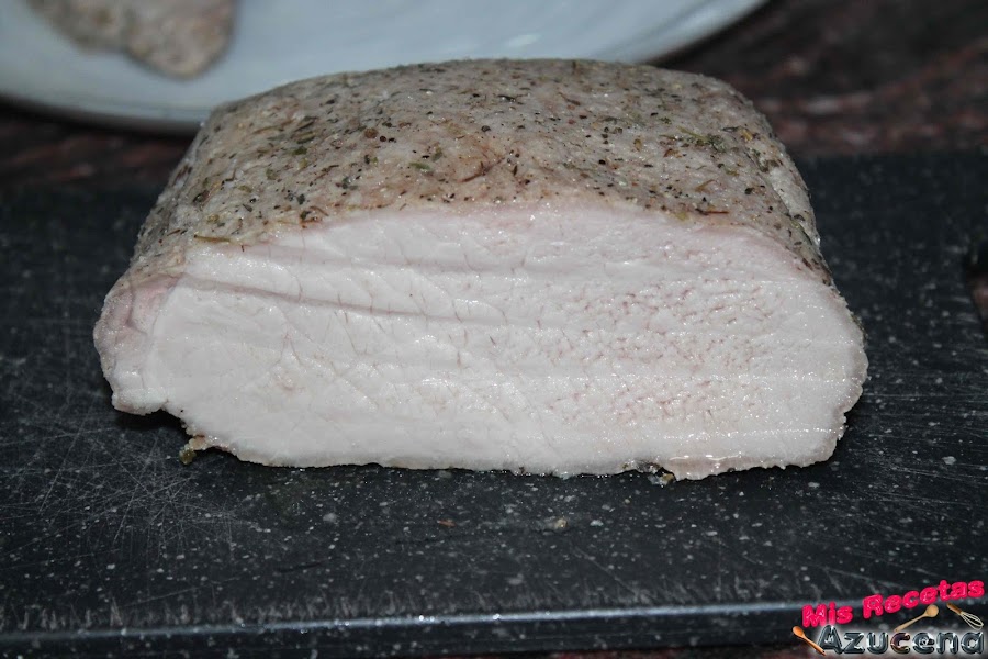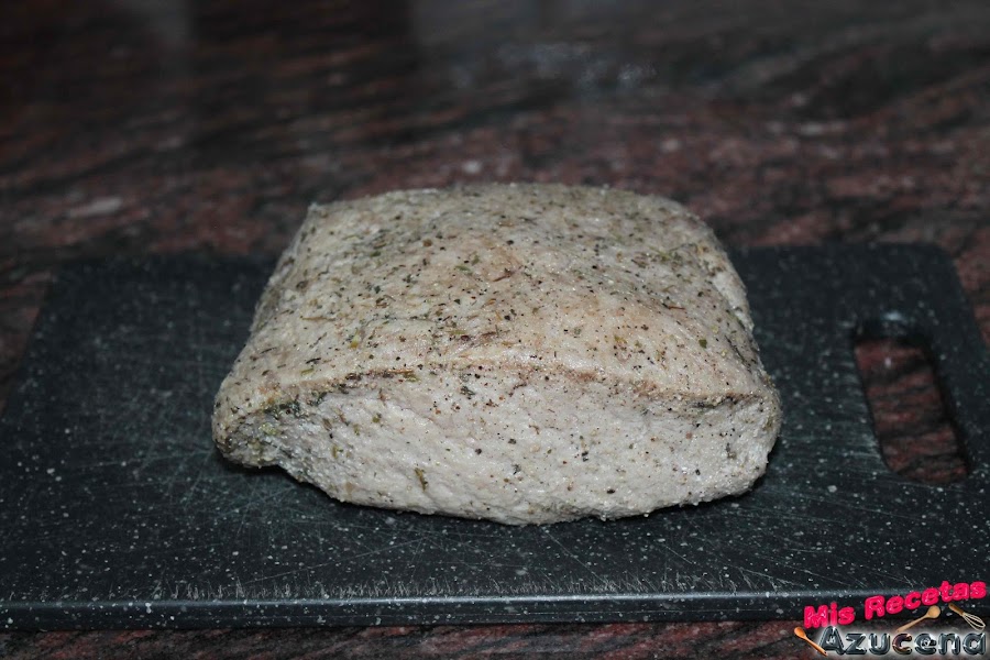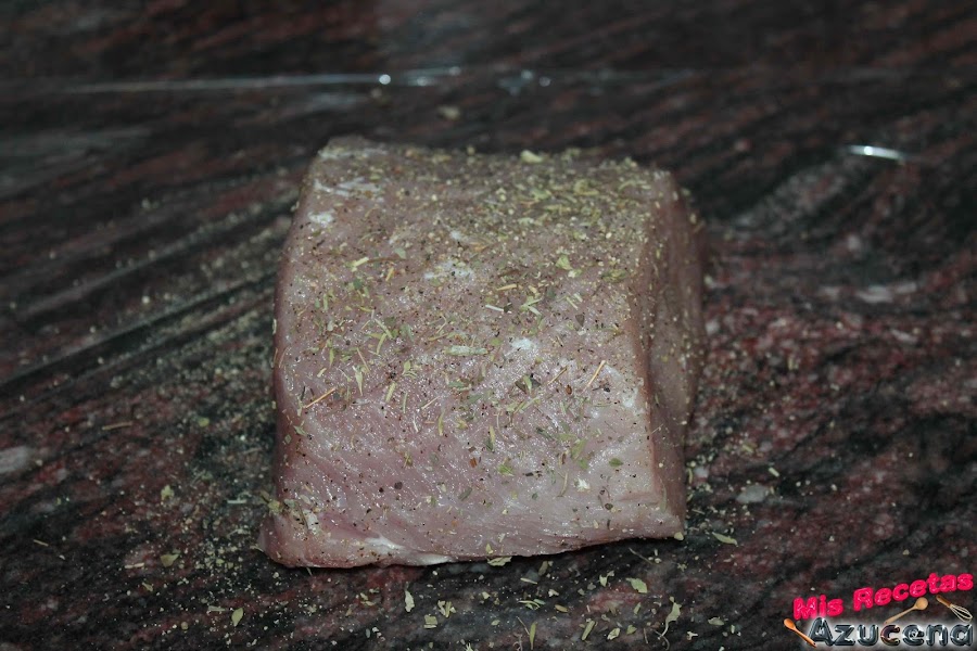 Para esta receta necesitaremos aliñar el lomo con antelación, le quitaremos toda la grasa, extendemos film transparente sobre nuestra encimera le ponemos un poco de hiervas provenzales y pimientas molidas, ponemos la carne y le pondremos por encima lo mismo, la liamos en el film y lo metemos en la nevera y lo dejaremos unas 12 horas, lo podemos hacer la noche anterior.