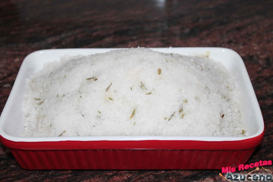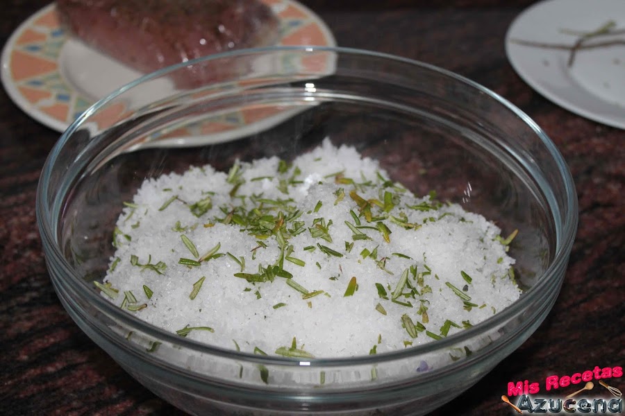 En un bol grande pondremos como 1 kilo de sal, junto con el romero que tendremos picado, removemos toda la sal y le añadiremos un poco de agua para que nos permita presionarla y se nos pegue.