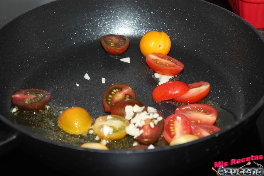 Ahora prepararemos el acompañamiento, ponemos una sartén al fuego a fuego medio cuando este caliente añadiremos unos ajos que habremos pelado y cortado en rodajas finas, le damos unos segundos y añadimos los tomates cherry cortados por la mitad,les ponemos un poco de sal, pimienta y los saltemos los tomates 2 minutos y retiramos del fuego.