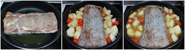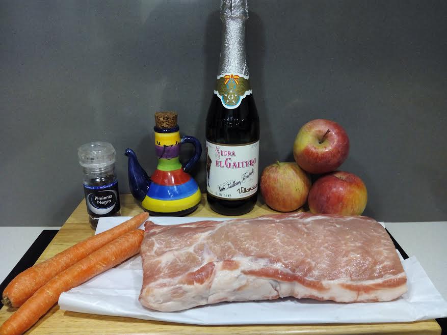 Ponemos una cacerola al fuego con el aceite y cuando esté caliente sellamos el lomo salpimientado por ambas caras. Cuando lo hayamos dorado agregamos las manzanas y las carlotas troceadas y a continuación la sidra. Lo dejamos a fuego medio alrededor de 1 hora. Pasado el tiempo, sacamos el lomo y trituramos la salsa.