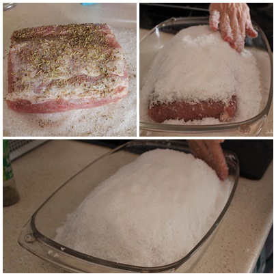 En una fuente de horno se pone en el fondo un centímetro de sal, encima el lomo.