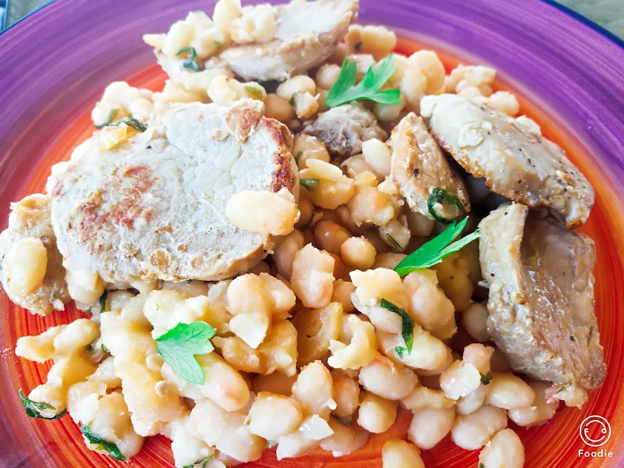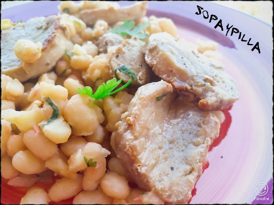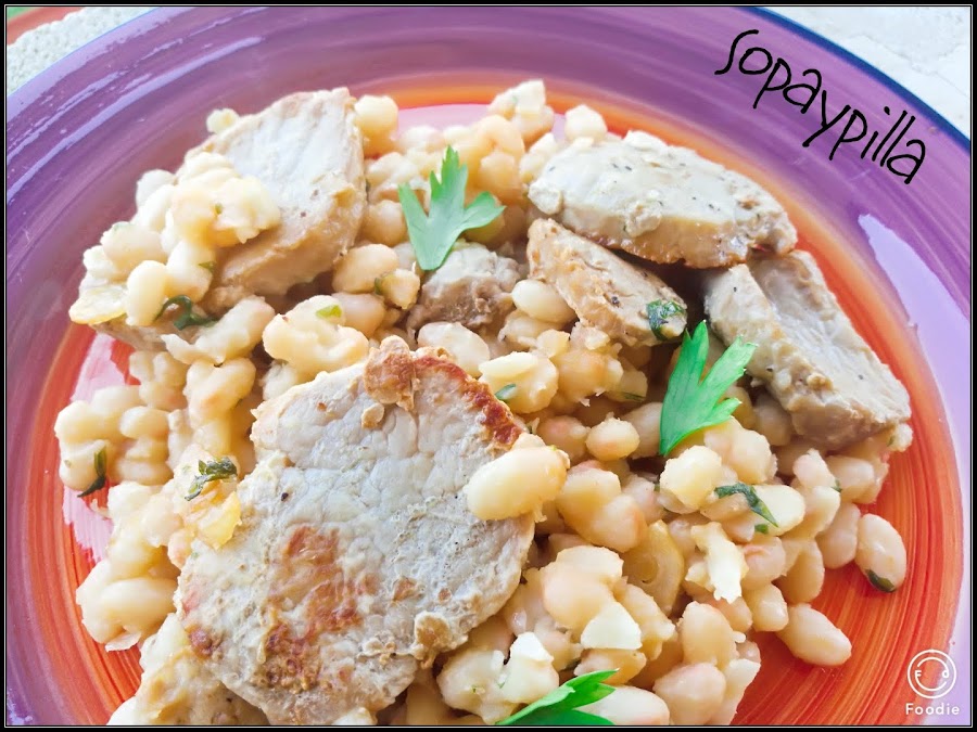 Toca plato completo de legumbres. A mi personalmente, las mongetes "judías" cocinadas así...ummmm me encantan. Os las traigo con un buen acompañamiento de lomo, convirtiendo el plato en un platazo!