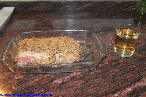 Una vez tengamos la carne bien untada con las especias, añadiremos el vino por uno de los lados de la bandeja sin que le caiga a la carne por encima.