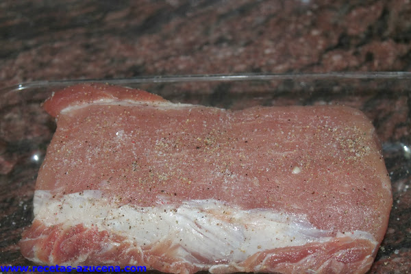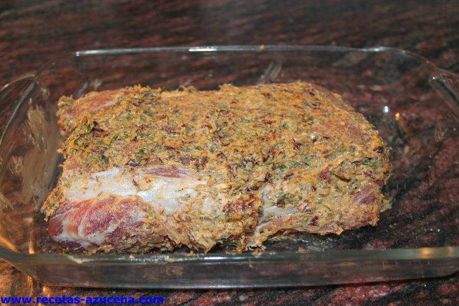 Cogemos la carne y la salpimentaremos bien y la pondremos en el centro de la bandeja, con ayuda de nuestras manos cogeremos las especias que tenemos en el bol y la untaremos por toda la carne bien.
