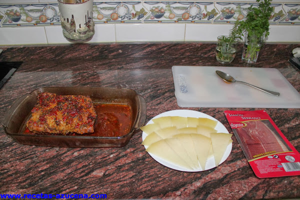 Mientras que reposa nos prepararemos otra bandeja apta para horno, le pondremos un poco de salsa, cogemos la pieza de carne, le quitaremos las puntas y la cortamos en cuatro trozos que colocaremos en la bandeja para ponerle por encima unas lonchas de jamón y estas la cubriremos con queso.