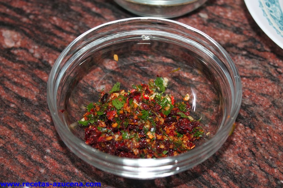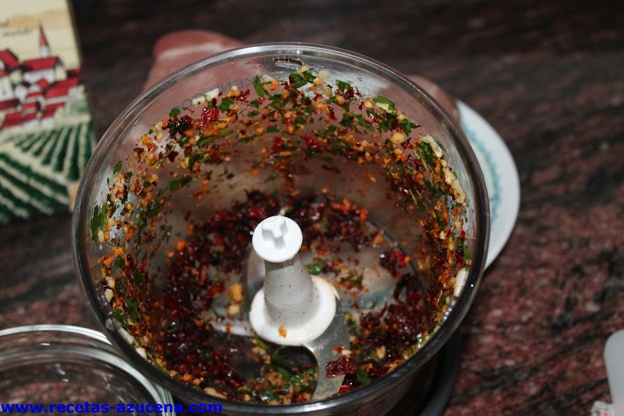 Ahora cogeremos la picadora y pondremos los dientes de ajo pelados, el perejil, los pimientos secos y lo picaremos bien, una vez lo tengas listo lo sacaremos y lo pondremos en un cuenco.