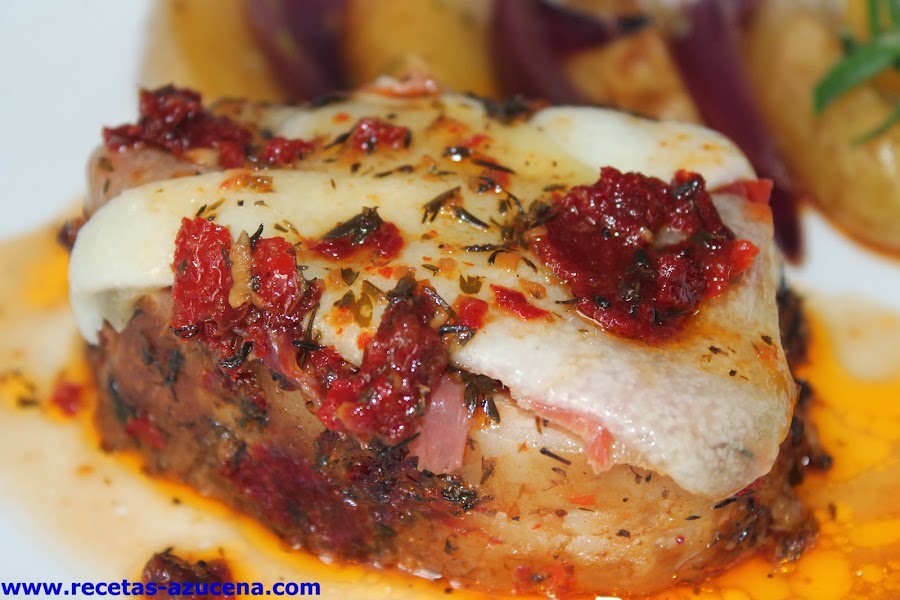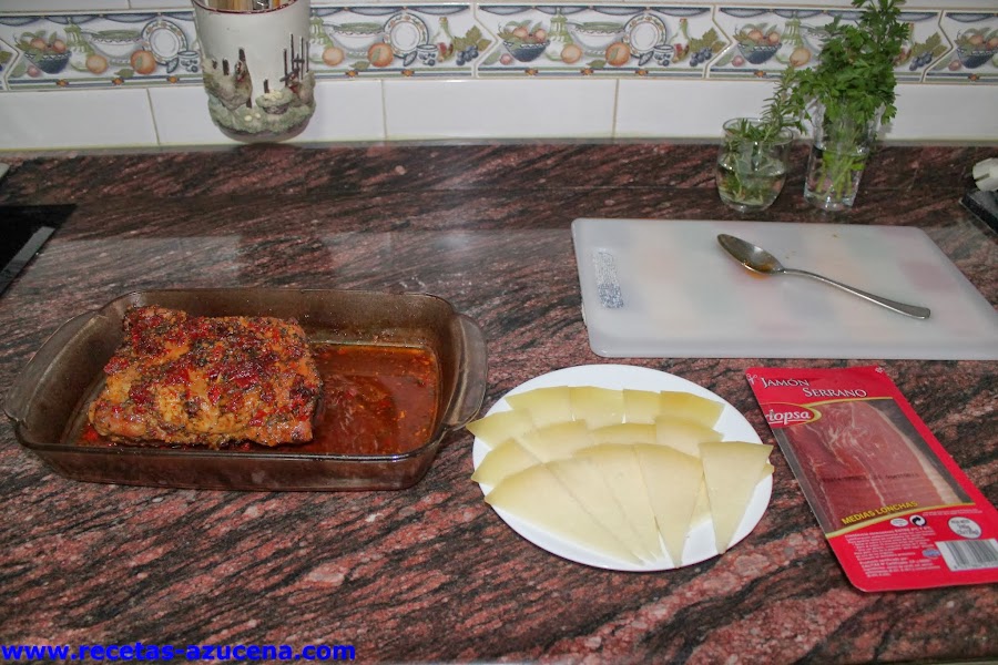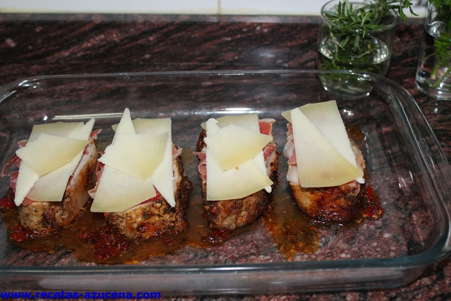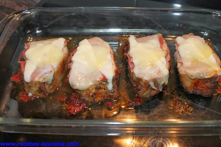 Cuando tengamos todos los trozos cubiertos con jamón y queso lo meteremos otra vez en el horno para que el queso se derrita, una vez que veas que está listo sacaremos la bandeja del horno y serviremos un trozo por comensal y le pondremos salsa de la bandeja, si quieres este último paso lo puedes hacer en la misma bandeja que preparamos la carne.