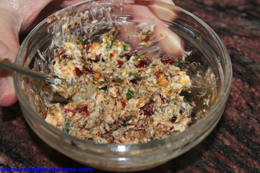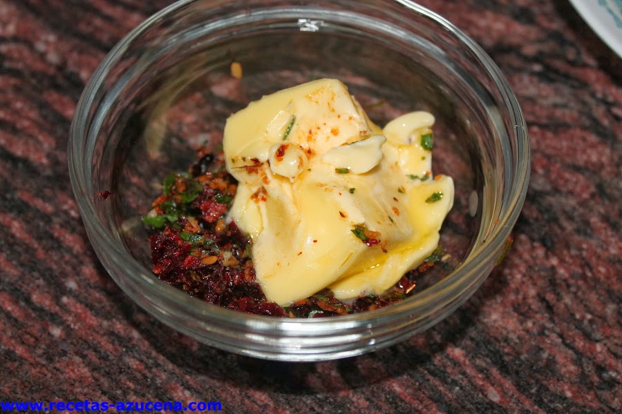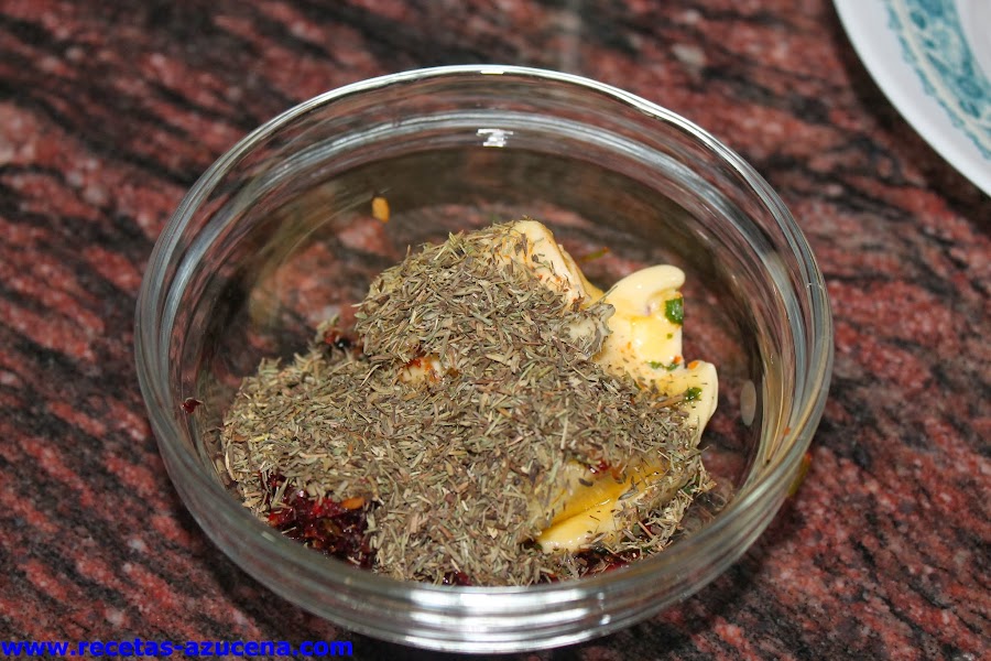 La mantequilla la tendremos con antelación sacada de la nevera, cuando la tengas que parece una pomada la añadiremos al cuenco donde tenemos la picada junto con el tomillo seco, con ayuda de una cuchara o un tenedor mezclaremos todo bien, reservamos.