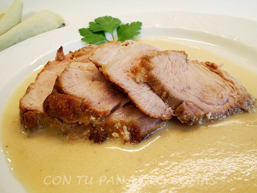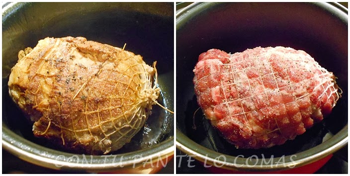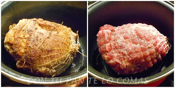 La receta de hoy se puede hacer con cinta de lomo o aguja de cerdo que es lo que he usado yo, e incluso con solomillos aunque el tiempo sería más corto por ser bastante más pequeños. La aguja o cabezada, tiene una forma más desigual pero es muy jugosa y por eso es mejor que el carnicero le ponga una red para que mantenga la forma al cocinar, o se puede hacer en casa con hilo de cocina. Esta receta lleva muy pocos ingredientes pero ya veréis qué cosa más rica!