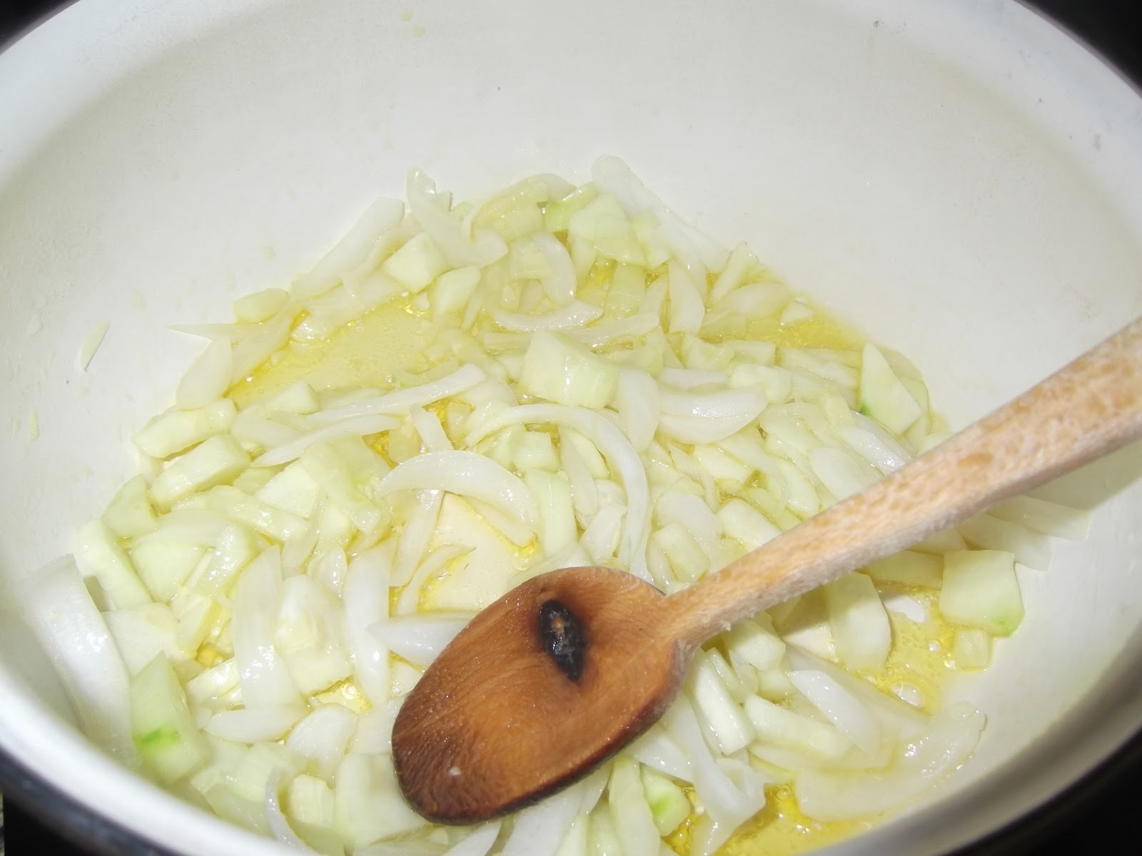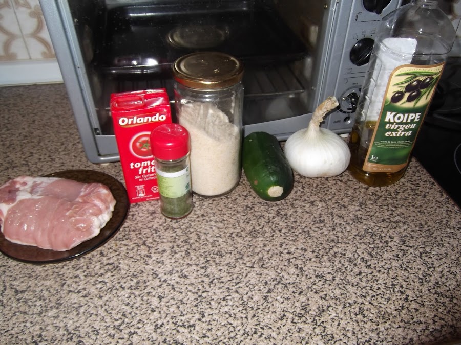 Lo primero que hacemos es picar la cebolla. Lavamos el calabacín y los picamos en daditos. En una cacerola echamos un chorro de aceite y ponemos a pochar la cebolla, cuando ha llevado unos pocos minutos se le añade el calabacín y se rehoga durante un rato hasta que las verduras estén cocinadas.