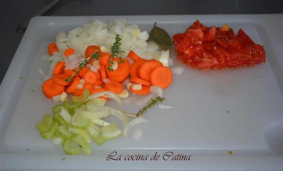 Limpiamos bien la carne y la metemos dentro de una malla para darle forma redonda (yo no he utilizado malla) . Salpimentamos al gusto y reservamos.Pelamos la zanahoria, la cebolla, le quitamos los hilos al apio y limpiamos de piel y semillas el tomate. Pelamos y cortamos en láminas los dientes de ajo. A continuación troceamos todas las verduras y reservamos.