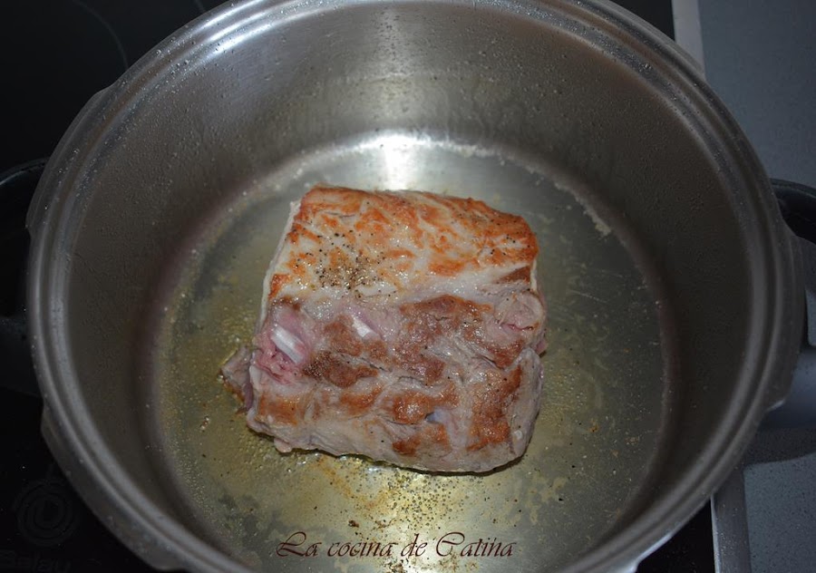 Ponemos al fuego una cazuela grande con un chorro de aceite y doramos la carne por todos los lados a fuego lento.