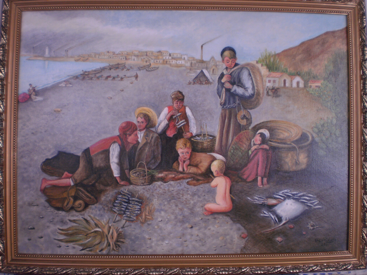 Es una estampa típica de Málaga, la sitúa en las playas de Bellavista, a la derecha el Monte San Antón, viéndose la bahía de Málaga al fondo, La Farola (el único faro del mundo femenino), la Málaga industrial con sus chimeneas en pleno rendimiento (finales siglo XIX), la literatura costumbrista de la época no dedica un episodio concreto a esta costumbre aunque sí se cita a propósito de narraciones de fiestas populares como la de ¡A pelar la pezuña!, del día de San Antón, en las playas de la Caleta, en donde la moraga era complemento de bailes y cantes flamencos en las ventas de la playa.