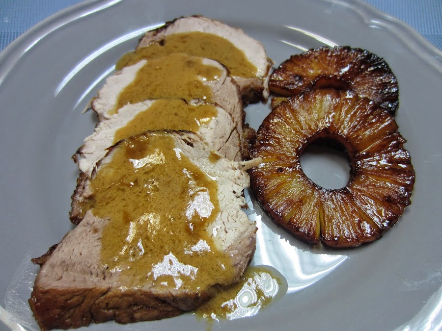En una sartén ponemos un chorro de aceite, añadimos la cebolleta y el ajo en brunoisse, una vez rehogada añadimos el jugo de la piña, el brandy, la mostaza y la nata (crema de leche). Cocemos hasta que espese. Colamos y reservamos al baño María.