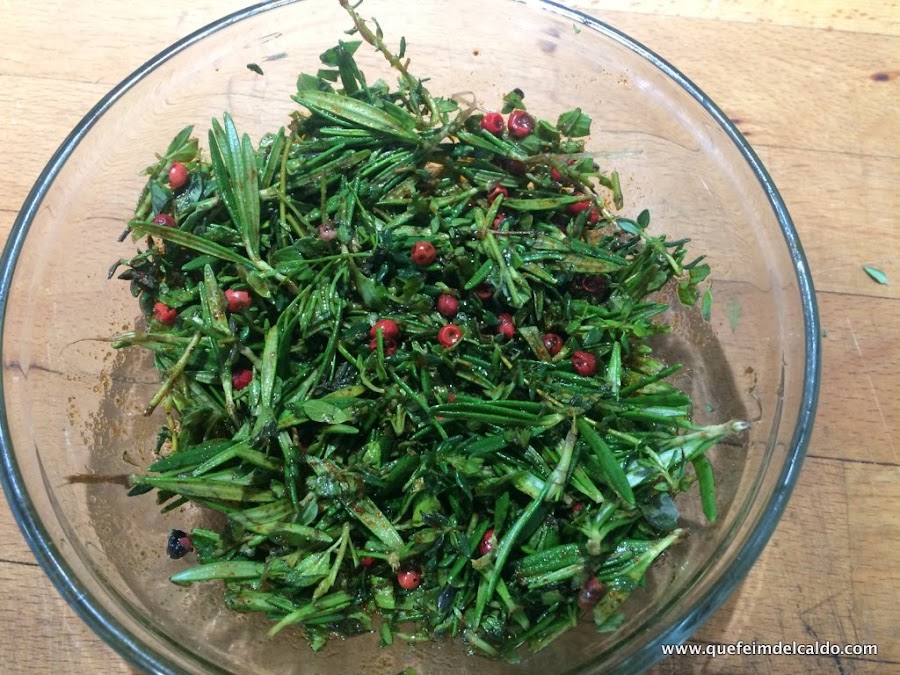 Picamos las hierbas aromáticas, incluimos también la pimienta rosa.