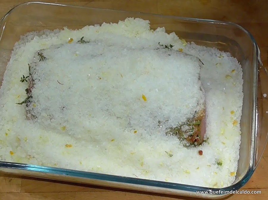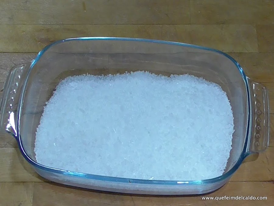 En una fuente de horno colocamos una base de sal de aproximadamente 1 cm.