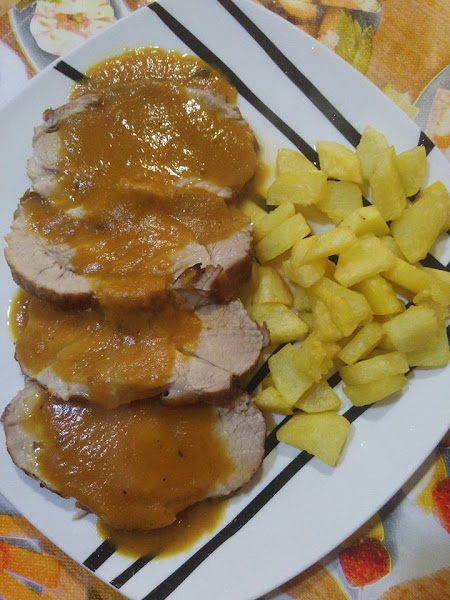 Cuando la verdura este pochada, añadimos el lomo y lo doramos por todos los lados, cuando este dorado le añadimos la botella de sidra entera, pasamos a una fuente de horno y metemos en el horno 1 hora o 1 h y media mas o menos a unos 170ºC. cuando pase este tiempo sacamos el lomo y trituramos la salsa, servimos fileteando el lomo y hechandole la salsa por encima.