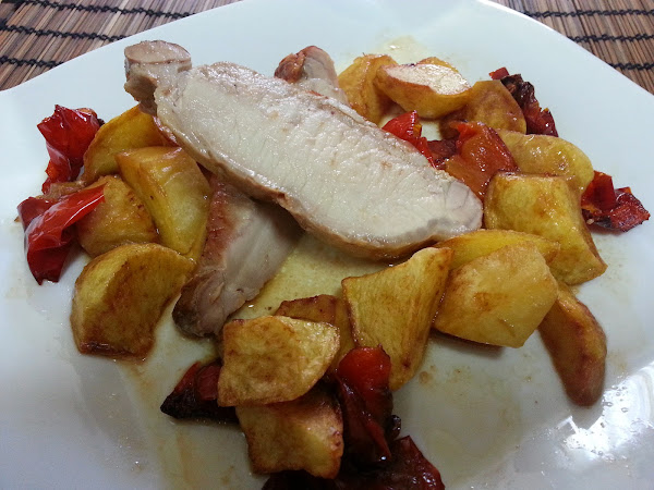 Lomo de cerdo al horno con patatas y pimiento rojo